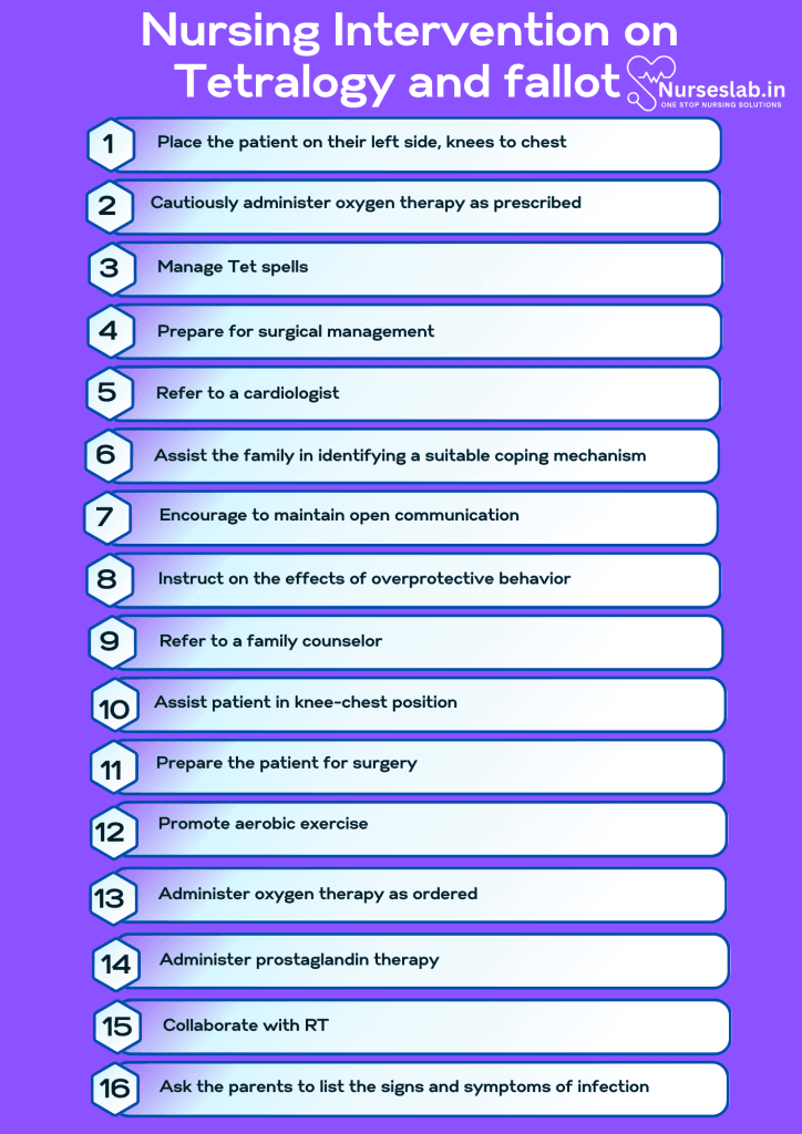 Nursing interventions are integral to the care of patients with Tetralogy of Fallot. By conducting thorough assessments, providing preoperative and postoperative care, and offering ongoing support and education, nurses play a pivotal role in improving health outcomes and enhancing the quality of life for these patients.