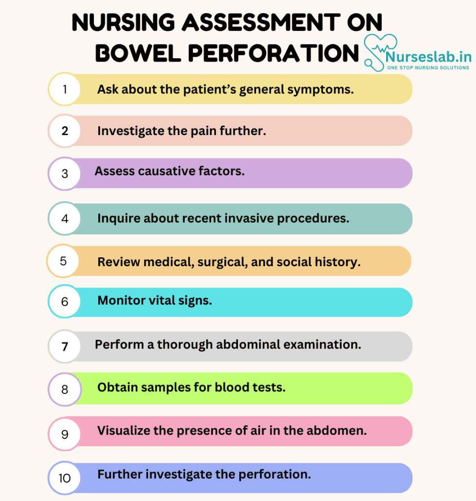 The first step of nursing care is the nursing assessment, during which the nurse will gather physical, psychosocial, emotional, and diagnostic data. In this section we will cover subjective and objective data related to bowel perforation.
