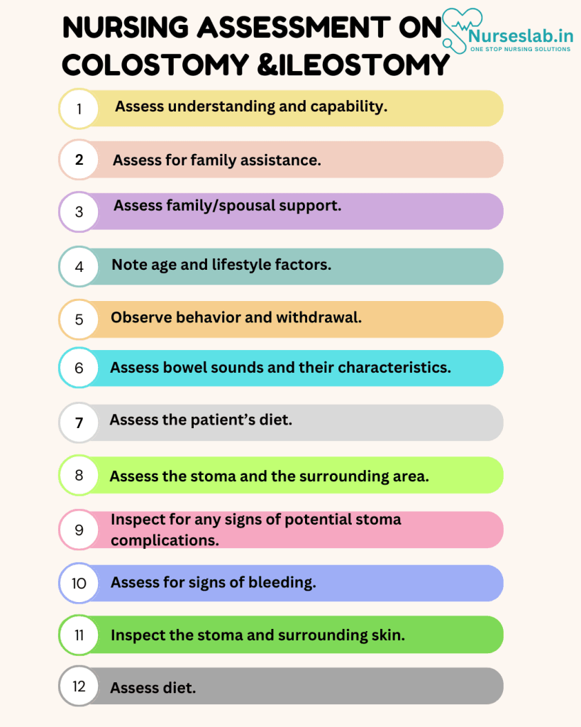 A thorough nursing assessment is essential to develop an effective care plan for patients with colostomies and ileostomies. This involves evaluating both the physical condition of the stoma and the patient’s overall health and psychological status.
