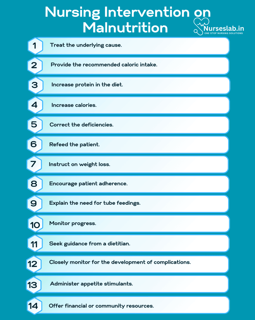 Rationale: Patients may lack understanding of malnutrition, its causes, and management strategies. Providing comprehensive education on the condition, its potential complications, and self-care measures, such as medication adherence and dietary modifications, is crucial for effective management. Encouraging patients to ask questions and involving them in care planning can enhance their understanding and compliance.