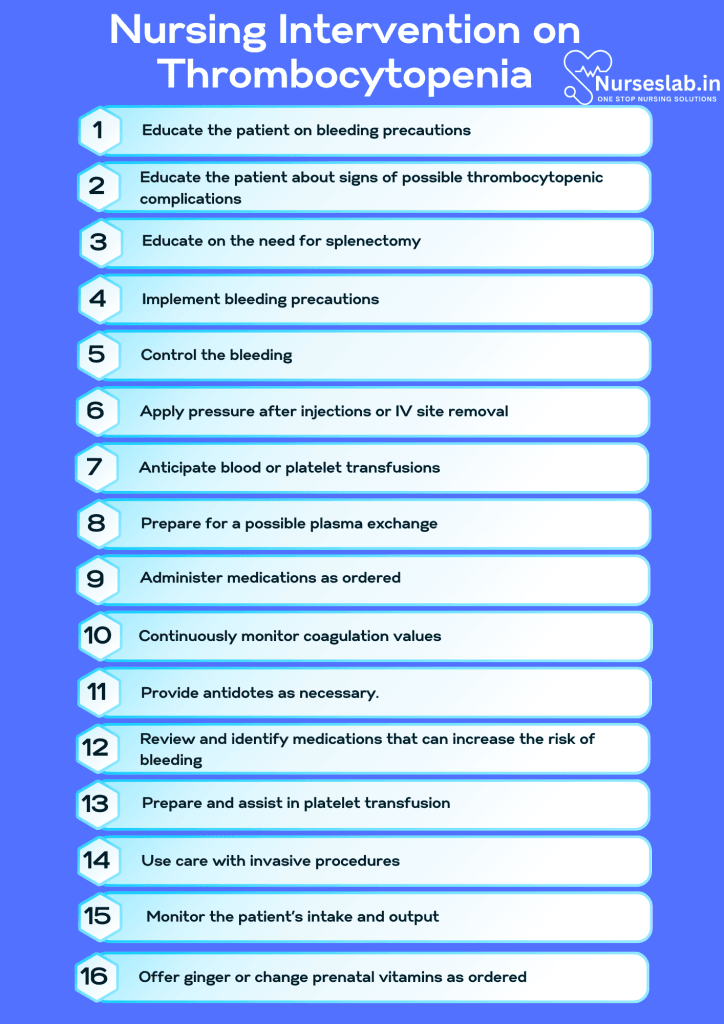 Thrombocytopenia, characterized by abnormally low levels of platelets in the blood, poses significant challenges in clinical settings. Platelets are essential for blood clotting, and their deficiency can lead to increased bleeding and bruising. Effective nursing interventions are crucial for managing this condition and improving patient outcomes.