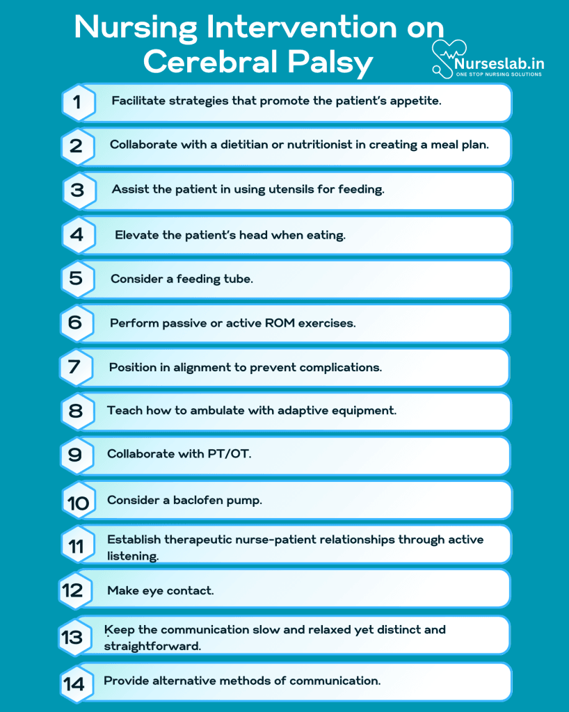 Rationale: Swallowing difficulties and motor impairments can make it challenging for patients with cerebral palsy to consume adequate nutrition. Nurses should monitor the patient’s weight, nutritional intake, and signs of aspiration. Working with a dietitian to develop a nutrition plan that includes appropriate textures and supplementation can help ensure the patient’s nutritional needs are met.