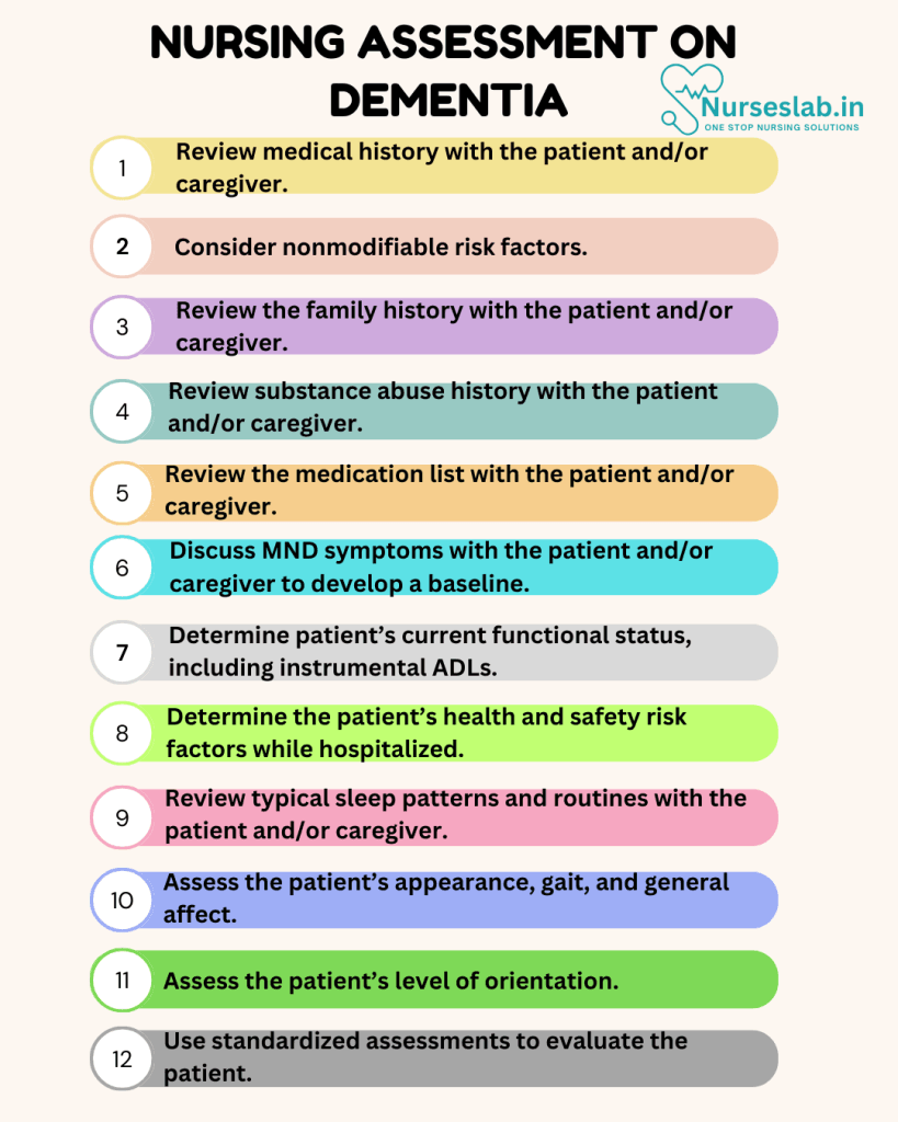 The first step of nursing care is the nursing assessment, during which the nurse will gather physical, psychosocial, emotional, and diagnostic data. In this section, we will cover subjective and objective data related to dementia and Alzheimer’s disease.