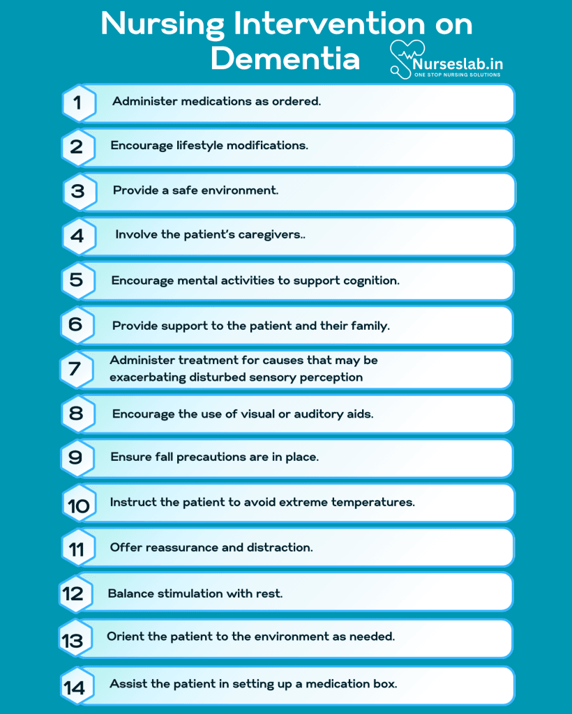 Nursing interventions and care are essential for the patient’s recovery. In the following section, you will learn more about possible nursing interventions for a patient with dementia or Alzheimer’s disease.
