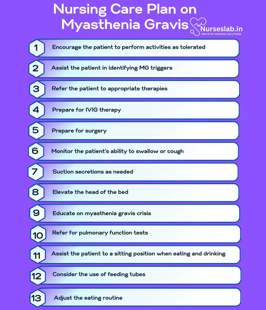 Nursing interventions for Myasthenia Gravis (MG) focus on managing symptoms, preventing complications, and improving the patient’s quality of life. Here are some key interventions: