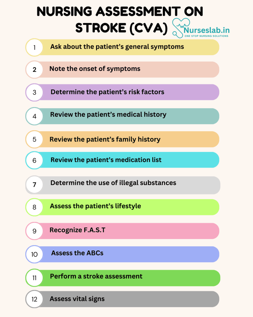 The first step of nursing care is the nursing assessment, during which the nurse will gather physical, psychosocial, emotional, and diagnostic data. In this section, we will cover subjective and objective data related to a stroke.