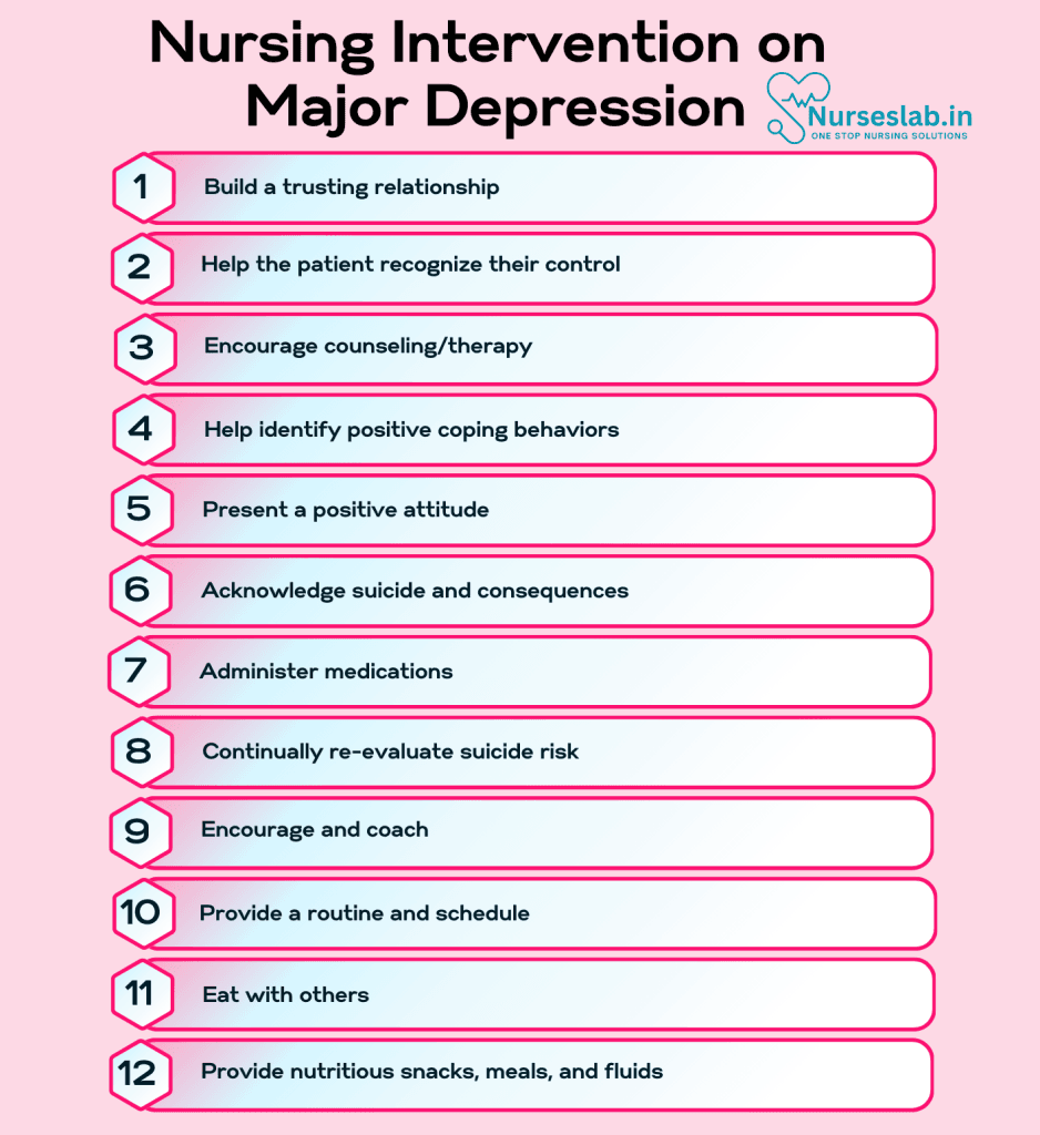 Major Depression, also known as Major Depressive Disorder (MDD), is a serious mental health condition characterized by persistent feelings of sadness, hopelessness, and a lack of interest or pleasure in almost all activities. It can significantly impair a person’s ability to function in daily life. Nursing interventions play a crucial role in the management and treatment of Major Depression. The following are key nursing interventions for managing Major Depression: