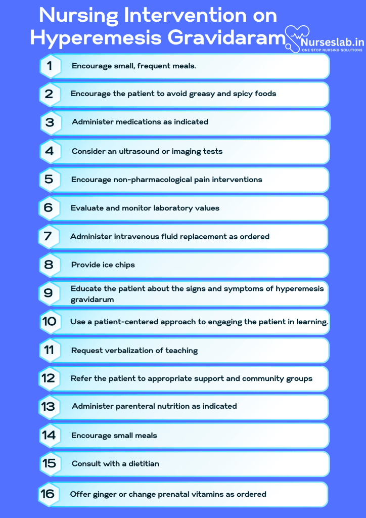Rationale: The distressing symptoms and potential complications of HG can cause significant anxiety in expectant mothers. Nurses can offer emotional support, educate patients about the condition, and involve them in care decisions to alleviate anxiety and promote a sense of control.
