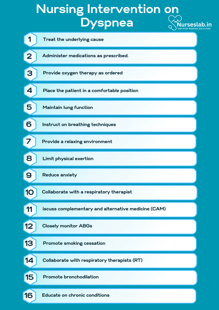 Rationale: The sensation of breathlessness can induce significant anxiety, creating a vicious cycle where anxiety exacerbates dyspnea. Assessing the patient’s anxiety levels, providing reassurance, and teaching relaxation techniques such as deep breathing exercises can help alleviate anxiety. Involving the patient in care planning and educating them about their condition and management strategies can empower them and reduce fear associated with dyspnea.