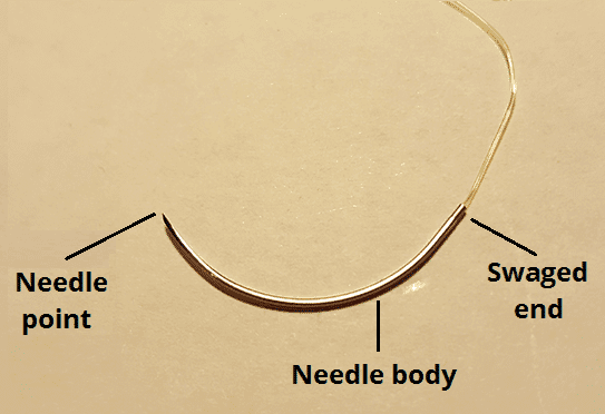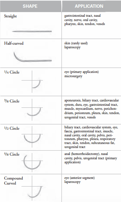 The needle shape vary in their curvature and are described as the proportion of a circle completed – the ¼, ⅜, ½, and ⅝ are the most common curvatures used. Different curvatures are required depending on the access to the area to suture.