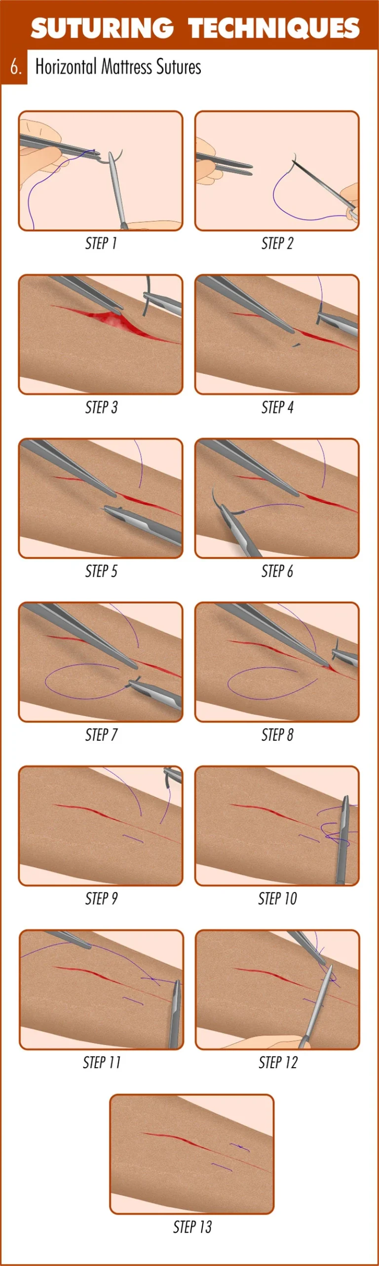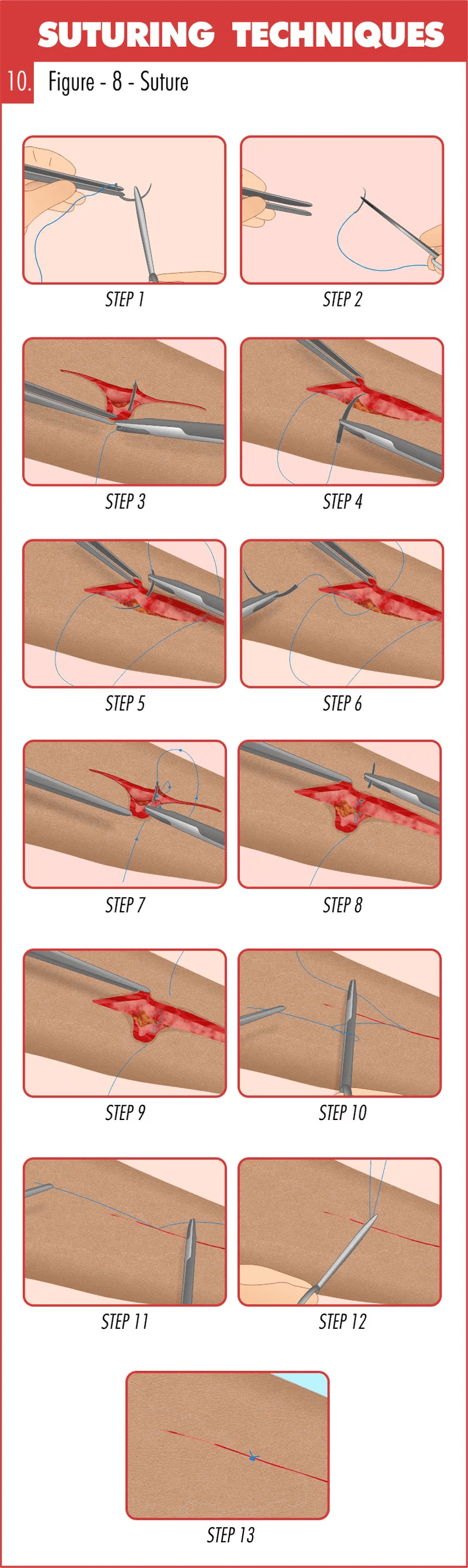 - Provide a step-by-step guide on how to suture, including positioning the needle, making the first stitch, and tying off the suture