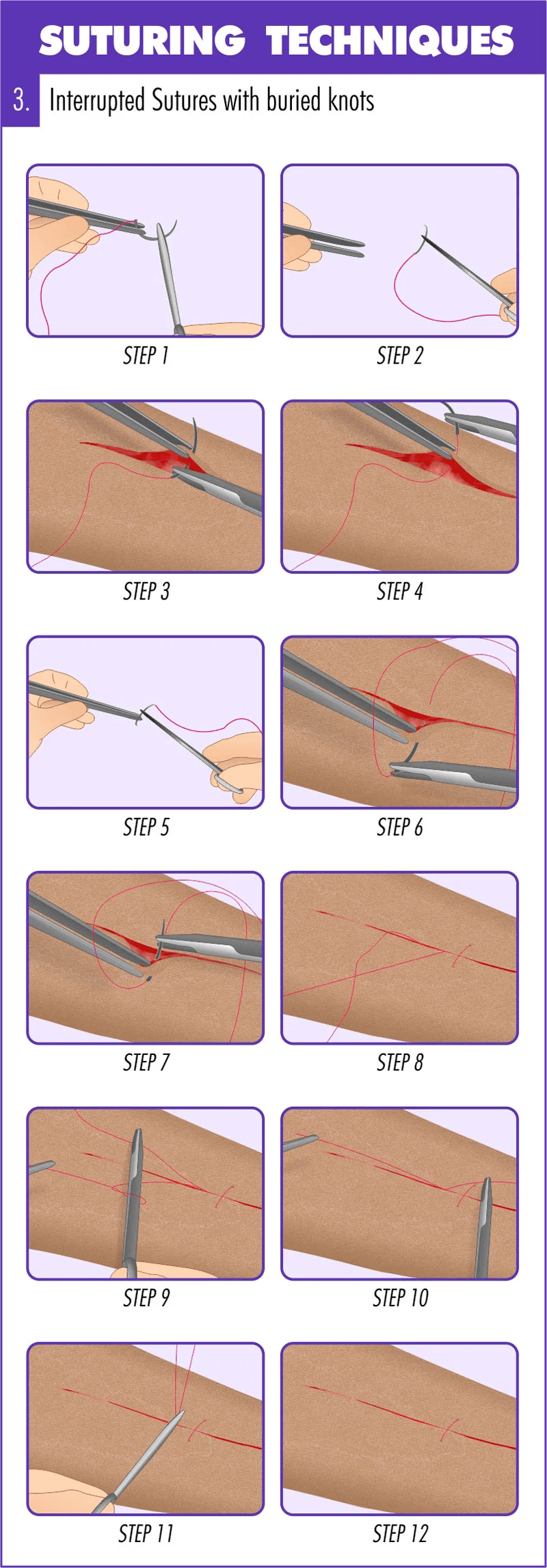 - Discuss different suturing techniques, such as interrupted sutures, running sutures, and mattress sutures