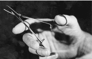 Place your thumb and ring finger in the holes. When using the needle holder, be sure to grab the needle until you hear the clasp engage, ensuring that the needle is securely held. You grab the needle at its half-way point, with the tip pointing upward. Try not to grab the tip; it will become blunt if grabbed